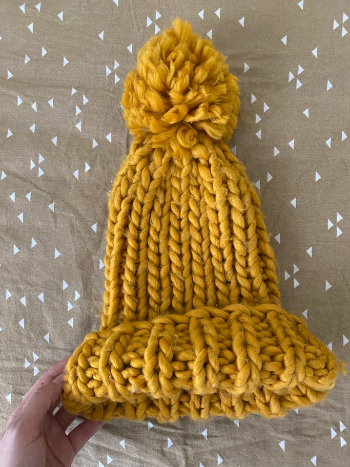 Kalın örgülü, ponponlu sarı kadın bere, renkli ve rahat bohem tarz sunar.