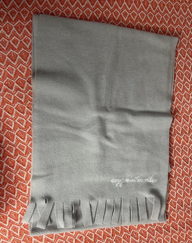 Gri renkte, nakışlı detaylara sahip, yumuşak kumaş ve püsküllü kenarları olan şal. Rahat kış kullanımı için uygundur. ❄️