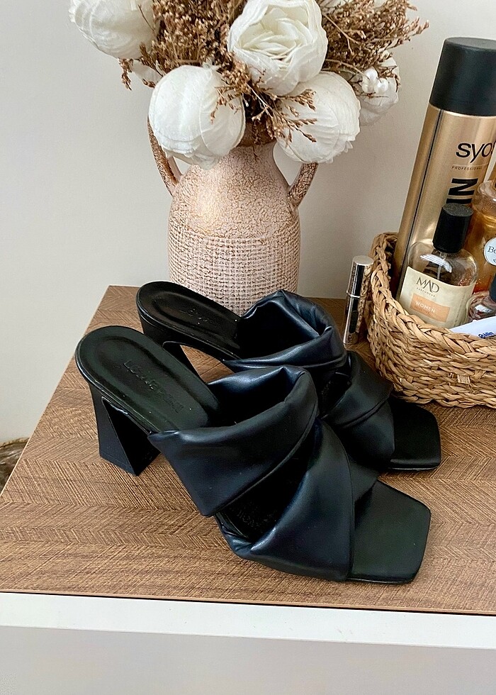 Kalın topuklu , siyah , deri , Rahat , yazlık terlik . Az kullanıldı , 9cm topuk uzunluğu , 40 numara ama eğer 39 giyiyorsanız da olur . Dünyanın en rahat topuklu terliği olabilir , ben çok beğenerek almıştım . marka : LCWaikiki .