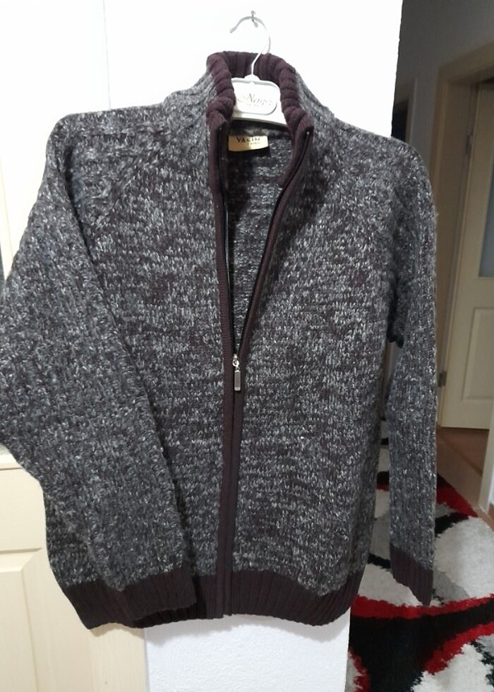 Dik yaka cepli triko ceket kalın olduğu için gayet sıcak tutuyor Örgü olduğu için esnek 100 kiloya kadar olur