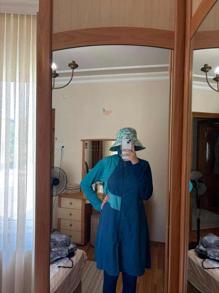 Kadın yağmurluğu midi boy, bol kesim, yüksek yakalı ve uzun kolludur. Koyu mavi sentetik kumaştan,haşema marka,