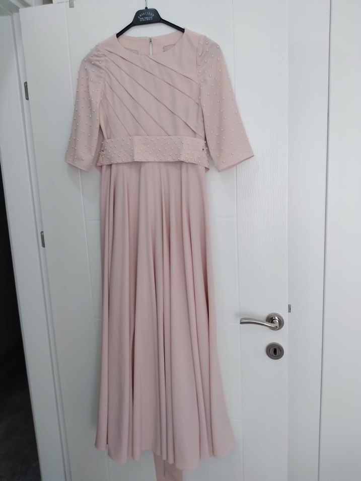 Kaliteli Kumaştan Pudra Rengi Abiye Anne-Kız Elbisesi