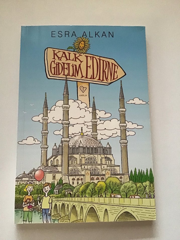 Esra Alkan'ın 'Kalk Gidelim Edirne' adlı kitabı, kapakta Edirne'nin simgesi cami ve köprünün renkli çizimiyle yer alıyor ⚜️