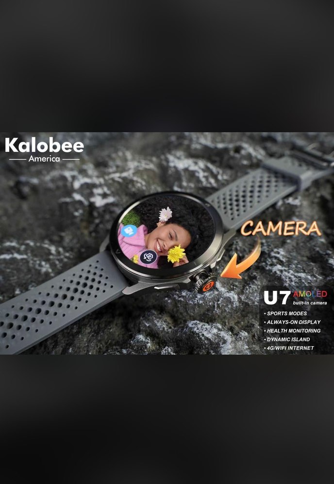 Kalobee U7 akıllı saat, dahili kamera, spor modları, sürekli açık ekran, kalp atış hızı takibi ve WiFi internet bağlantısı sunar. Siyah renkte, canlı gri kayışlı.