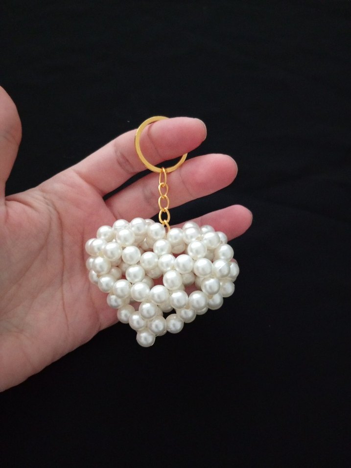 Altın halka ile bağlanmış, beyaz boncuklardan yapılmış kalp şeklinde cesur bohem tarzda anahtarlık. Minimalist ve renkli bir dokunuş sağlar. Sevgililer günü için küçük hediye istenilen renkte yapılır ☺