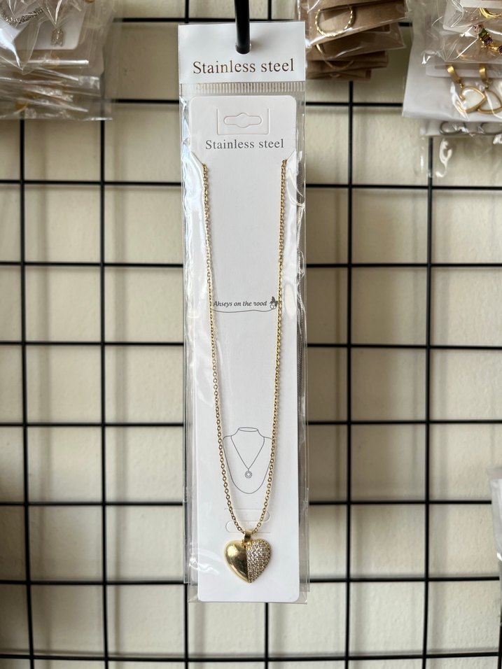 Altın renkli, zincir detaylı ve baskılı kalp kolye. Paslanmaz çelikten üretilmiş, günlük kullanıma uygun midi uzunlukta, çağdaş Paris tarzı.