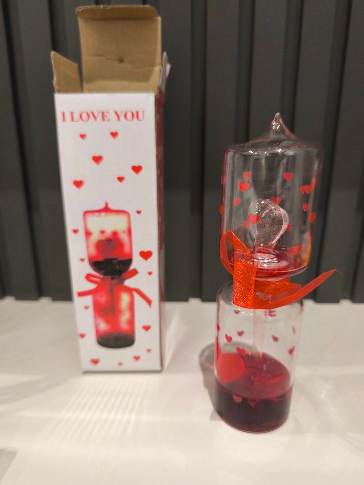 Kırmızı kalpler ve kurdele ile süslenmiş cam aşk ölçer.❤️