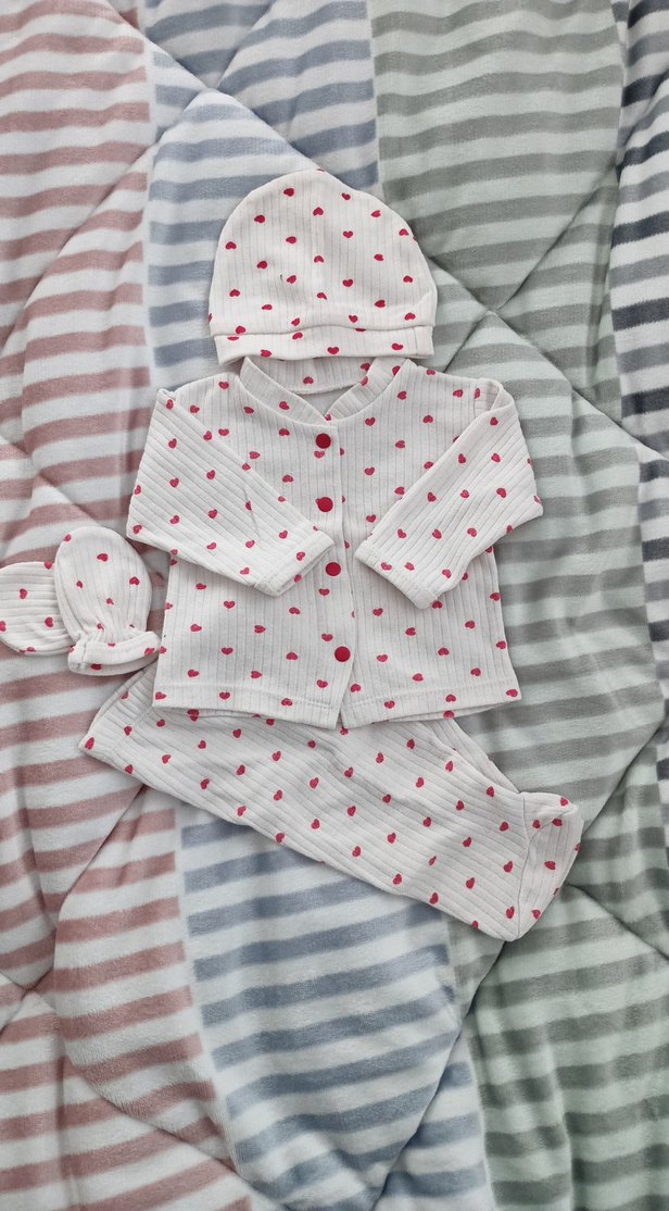 Uzun kollu, yakalı beyaz pijama takımı, kırmızı kalp desenleriyle süslenmiş. Şapka ve eldiven dahil, yumuşak ve rahat kumaştan üretilmiştir. ❤️ önlüğü de dahil 5 parça