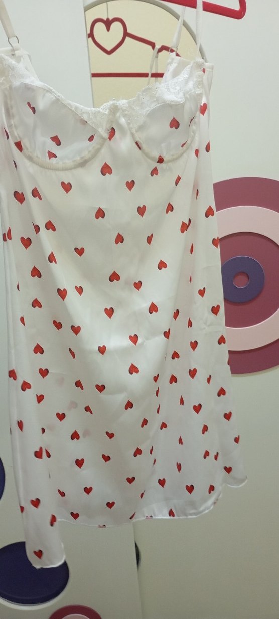 Kalp desenli, beyaz tabanlı, kolsuz ve vücuda oturan midi uzunlukta kadın geceliği, bohem Paris tarzını yansıtıyor. ❤️