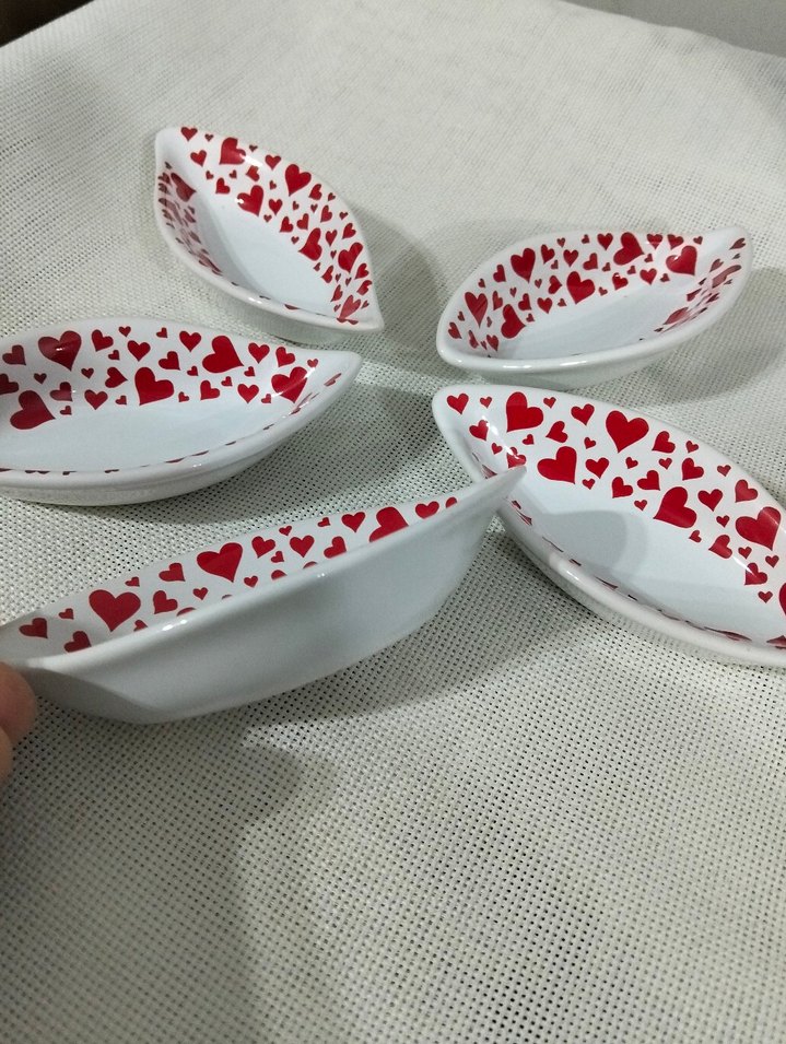 Beyaz seramikten yapılmış, kırmızı kalp desenli renkli sosluk seti. ️