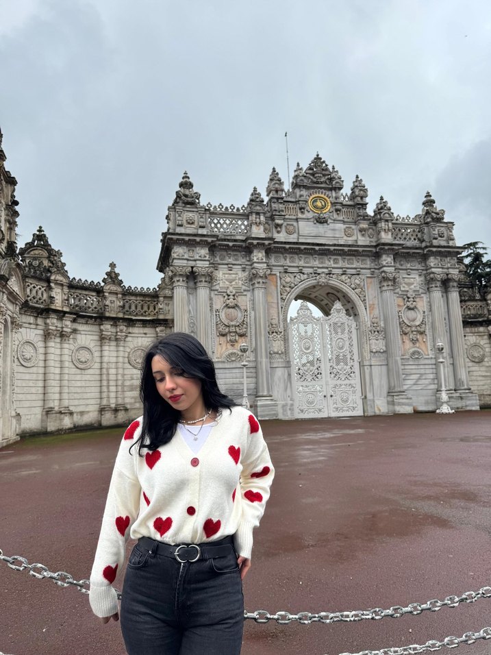 Uzun kollu, V yaka, beyaz triko kazak. Hafif batik desenli kalp figürleriyle salaş kesim, sokak stiline uygun. ❤️