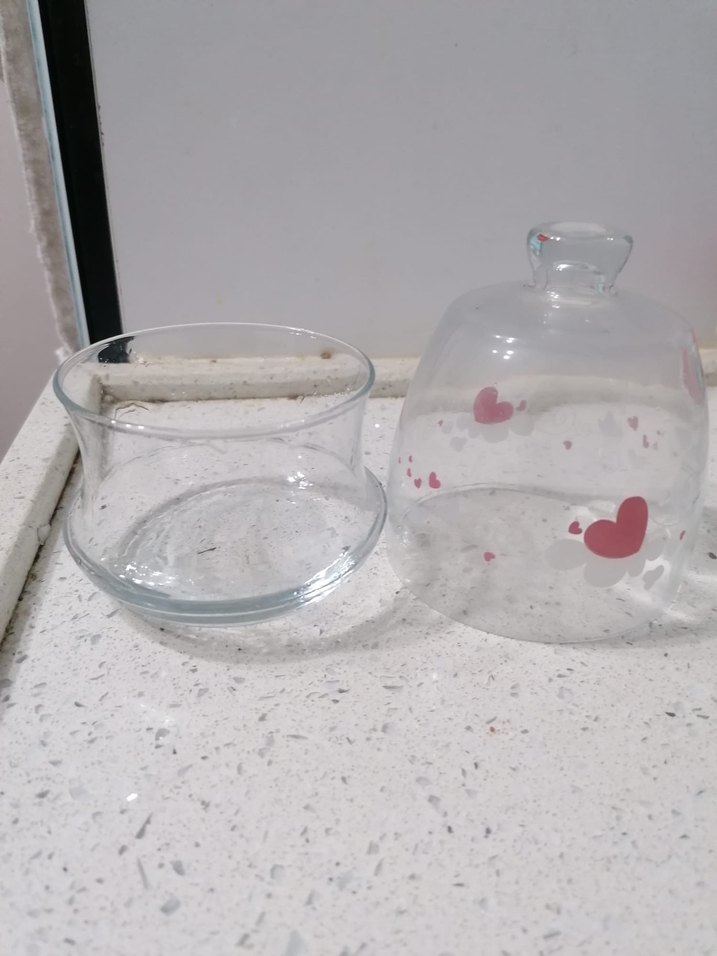 Yuvarlak cam şekerlik ve üzerinde pembe kalp desenleri bulunan şeffaf cam kapak. Kapakta kolay kaldırma için küçük bir tutacak bulunur. ️6 lı set halinde