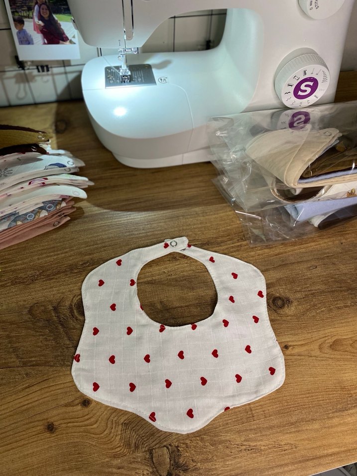 Yumuşak kumaştan yapılmış, renkli kırmızı nakışlı kalp desenli beyaz bebek önlüğü. Yuvarlak yaka ve kolay kullanım için çıtçıtlı kapanışa sahiptir.