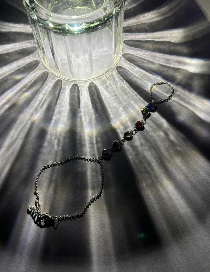 Kalp desenli, zincir detaylı çok renkli kadın el zinciridir. Günlük kullanıma uygundur.