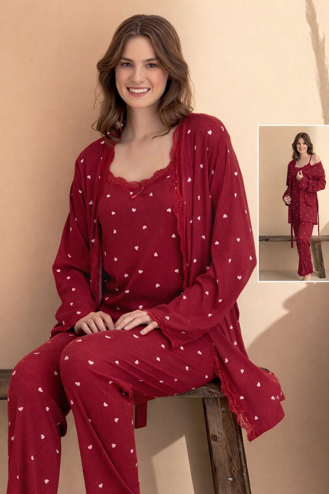 3 Parça askılı pijama, sabahlık takımı. Fitilli dokudadır. Üzerinde küçük kalp desenleri bulunur, rahat ve çağdaş bir tarza sahiptir. ❤️ S-M /L /XL /XXL Bedenler. Sipariş vermeden önce stok sorunuz.