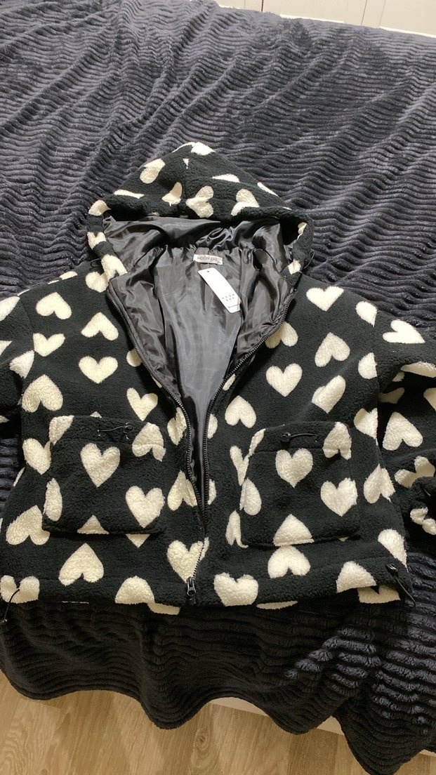 Bol kesim, uzun kollu kapüşonlu peluş mont. Siyah zemin üzerine beyaz kalp desenli, kürk detaylı, midi boyda rahat bir tasarım. Marka temsilidir