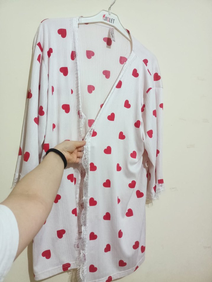 Uzun kollu, bol kesim beyaz sabahlık, kırmızı kalp desenleri ile rahat ve sokak stiline uygun. Kenarlarında dantel detayları bulunur. ❤️