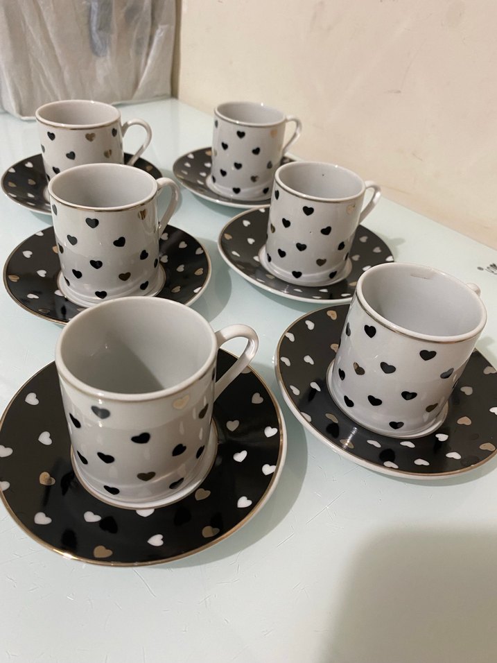 Beyaz fincanlar ve siyah tabaklarda küçük kalp desenleri bulunan, koyu ve beyaz tonların uyumuyla şık kahve fincan seti. ☕ Birisinde ufak bir kusur var ne zaman oluştu fark etmedim bile.