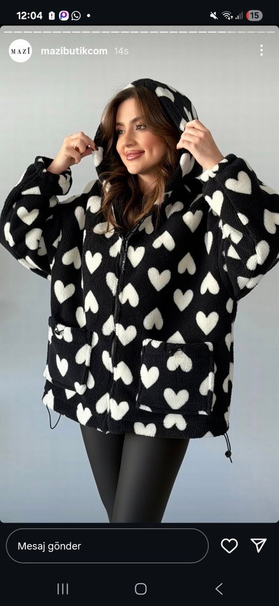 Kalp Desenli Siyah Kapüşonlu Kadın Mont