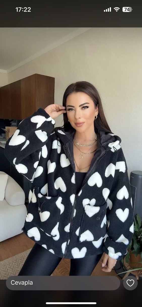 Siyah ceket, uzun kollu Standart beden yumuşak ve sıcak kumaştan kalp desenleri ve kürk detaylarıyla