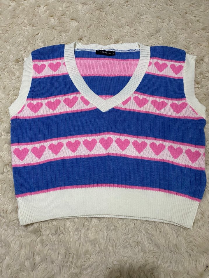 V yaka, kolsuz örgü süveter. Pastel mavi, pembe ve beyaz şeritler üzerinde kalp desenleri bulunur. Rahat kesim ve normal boyda, günlük kullanım için uygundur.