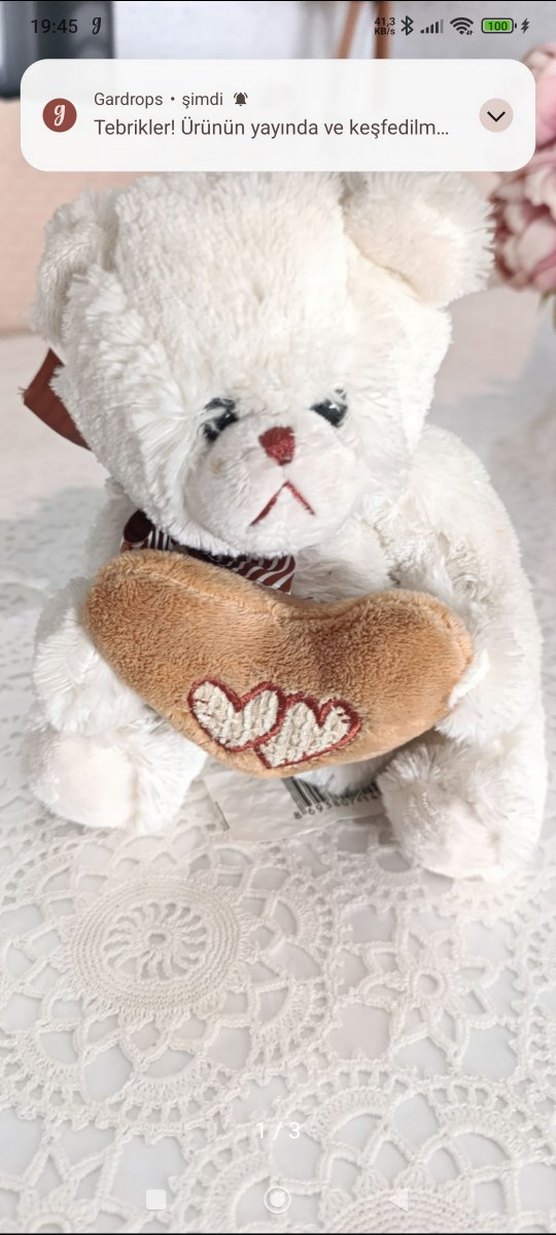 Yumuşak beyaz peluş ayıcık, üzerinde nakışlı kalpler bulunan açık kahverengi kalp tutuyor.