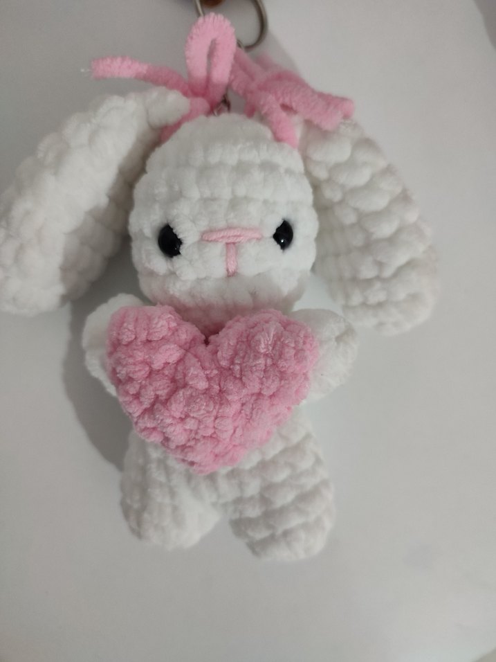 Yumuşak beyaz peluş tavşan, pembe kalp tutuyor ve pastel tonlarda anahtarlık olarak tasarlandı. Dokulu kumaşı rahat bir his veriyor. istenilen renkte örülür