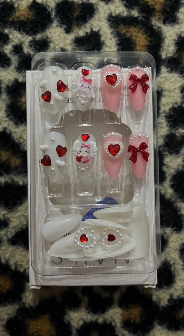 Kırmızı kalp figürleri, fiyonklar ve inci görünümlü boncuklarla süslenmiş beyaz ve pembe takma tırnak seti.