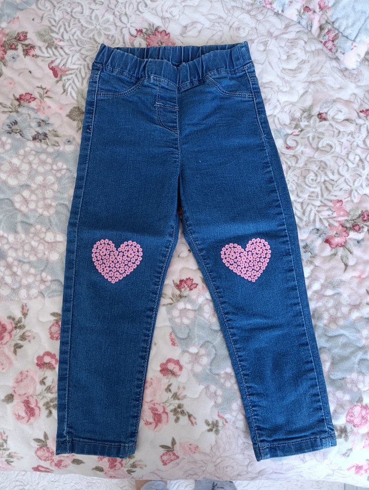 Kızlar için dar kesim kot pantolon, dizlerde pembe kalp desenleriyle, trend sokak stili için uygun.