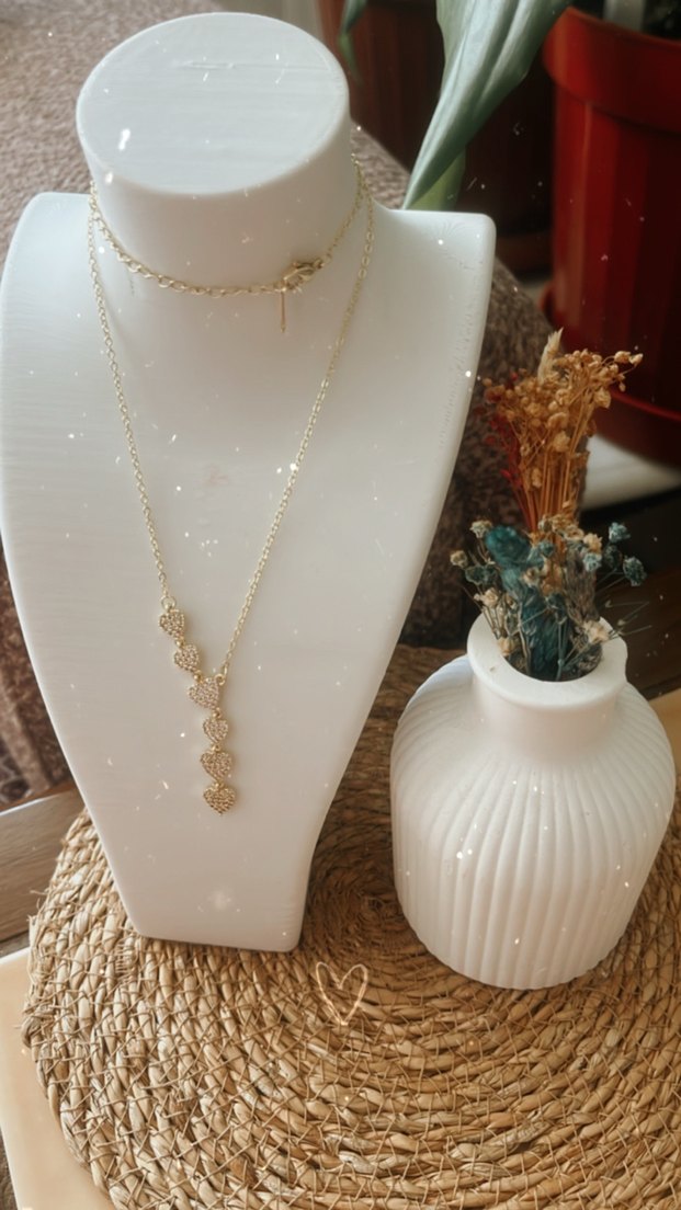 Uzun, altın renkli, kalp detaylı ve Y desenli bu kolye, minimalist bohem tarzına uygundur ve günlük kullanıma idealdir.