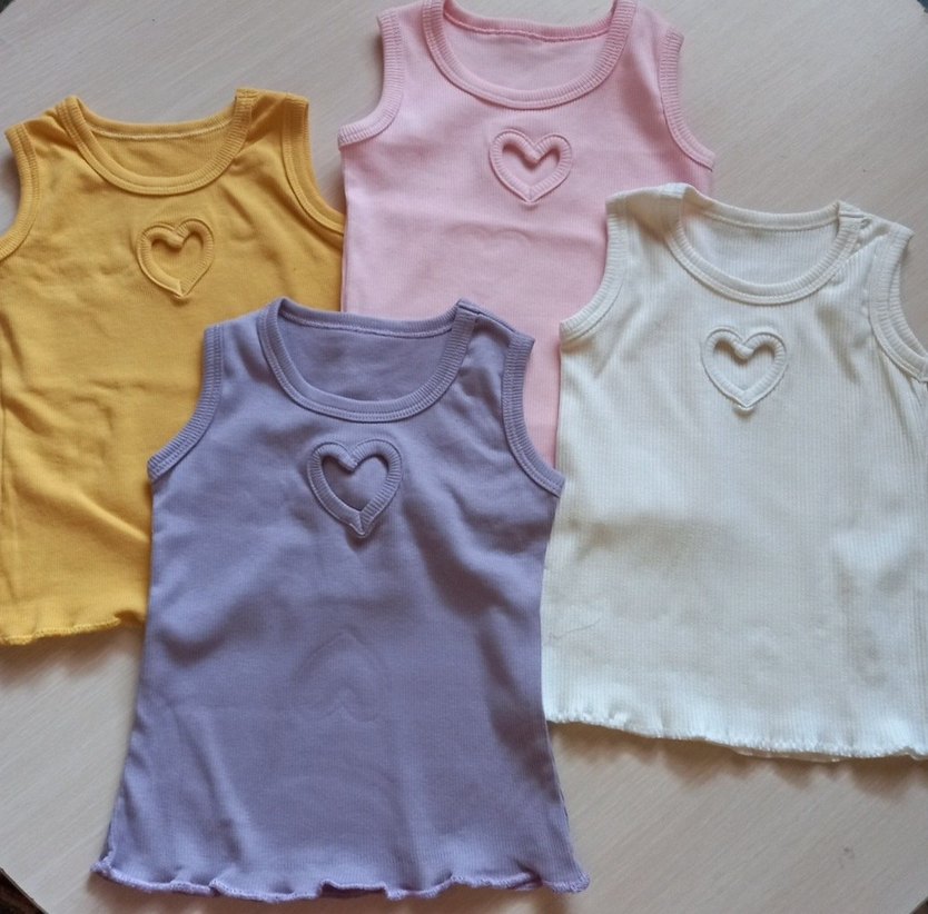 Kalp detaylı, pastel tonlarda çocuk atletleri. Yumuşak ve rahat kumaş, bej, pembe, sarı ve mor renk seçenekleriyle.