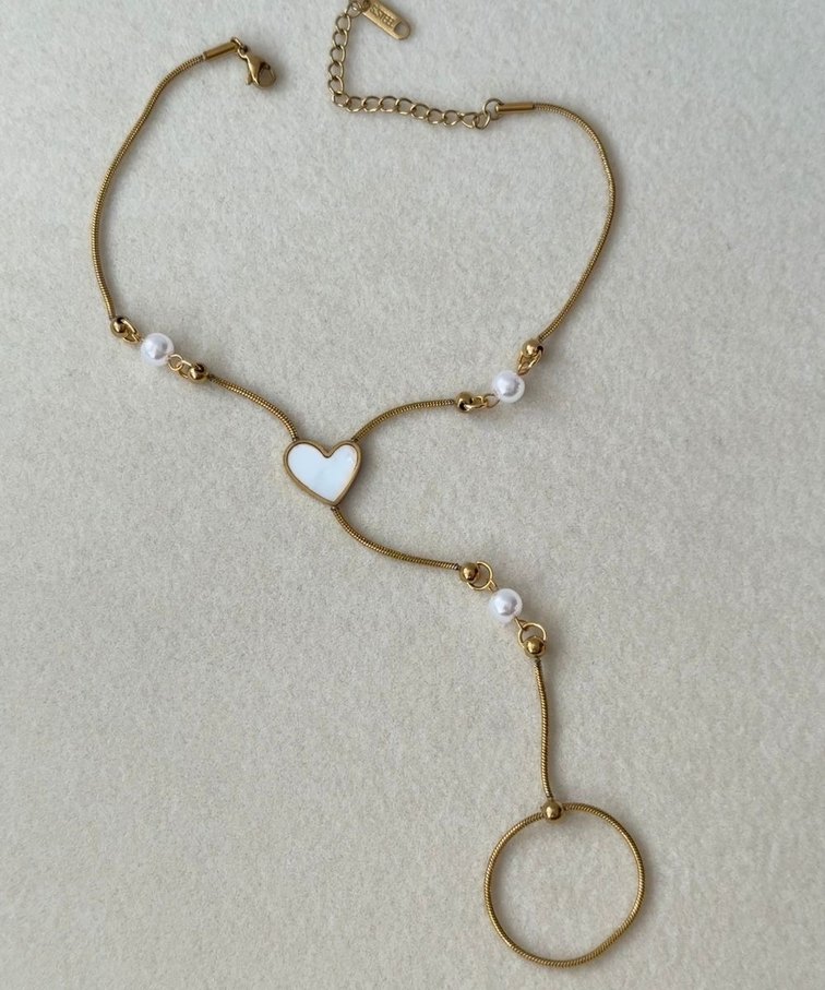 Altın renkli, boncuklu inci detayları ve kalp figürlü merkeziyle bohem tarzda kadın el zinciri. Günlük kullanıma uygun şık tasarım.