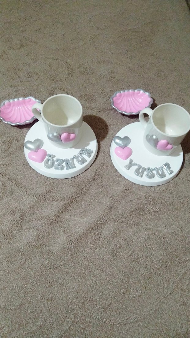 İki pastel pembe fincan ve tabaktan oluşan set, kalp süslemeli ve isimli, sıcak içecek paylaşımı için uygun. ☕İkili set fiyatıdır