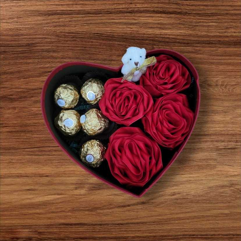 Kalp kutu içinde Solmayan güller, paketli çikolatalar ve küçük beyaz oyuncak ayı bulunur .