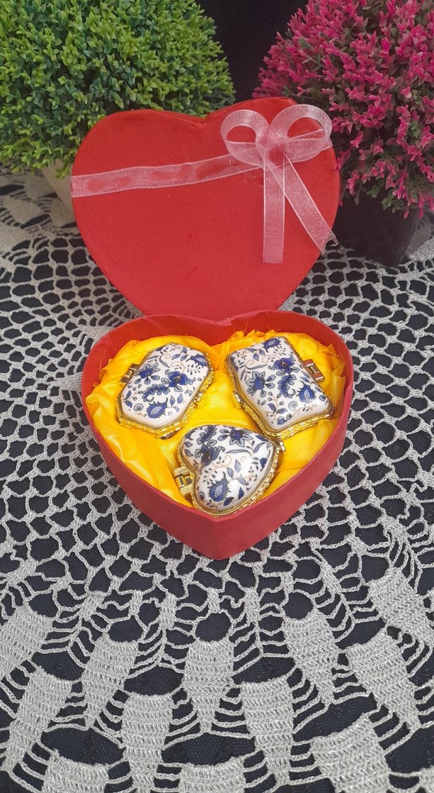 Kırmızı kalp kutu içinde sarı kumaş üzerine yerleştirilmiş, renkli desenli ve altın detaylı üçlü hediyelik set. porselen takı Kutusu sıfır üründür
