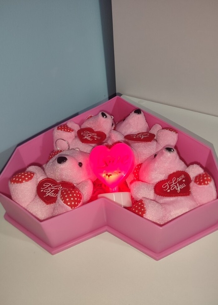 Kalp kutu içinde kutu ile aynı renk l love you yazılı 4 adet ayıcık bulunmaktadır ortasında kalp şeklinde love yazılı ışıldak bulunmaktadır. Ürün duvara asılabilir ayıcıklar anahtarlık olarakta kullanılabilmektedir.