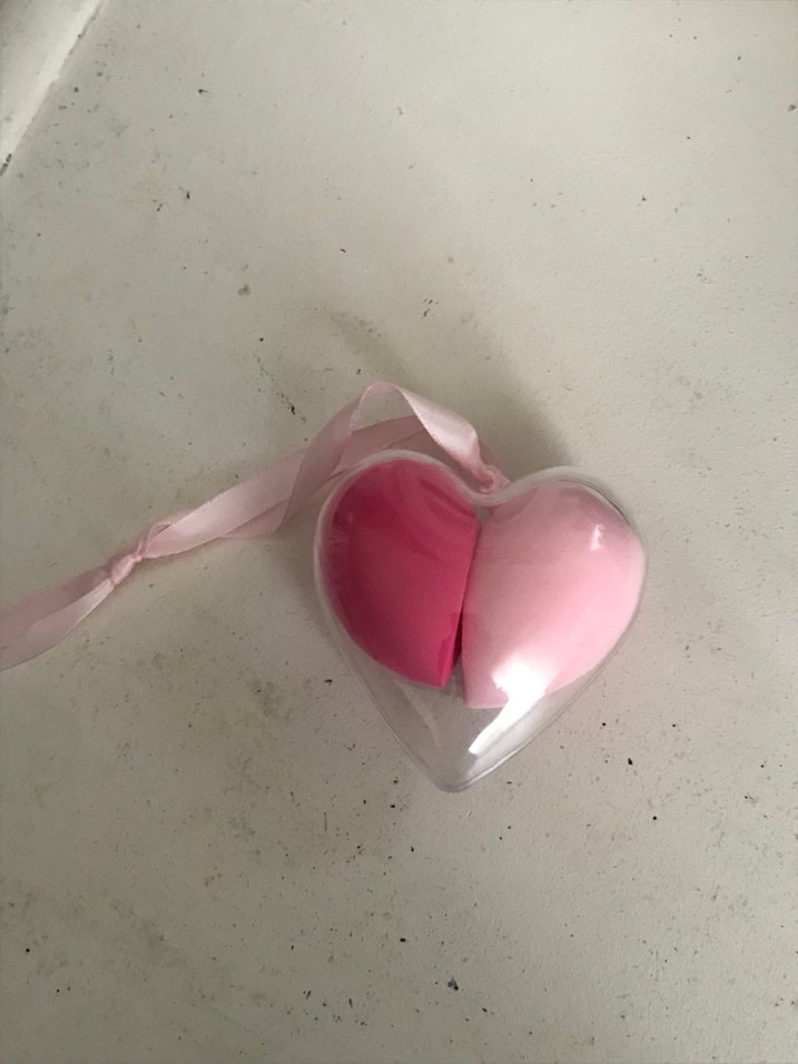 Kalp şeklinde şeffaf kutuda, kurdeleli pastel pembe makyaj süngeri seti.