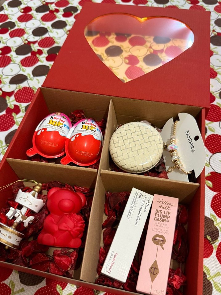 Çikolata, kompakt ayna, Pandora tarzı bileklik, kırmızı ayıcık figürü ve dudak dolgunlaştırıcı ürünler içeren kalp kutulu renkli hediye seti.