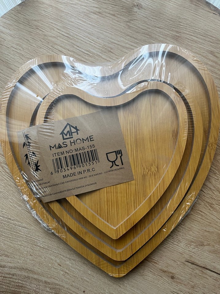 Bej renkli, parlak yüzeyli kalp şekilli ahşap sunum tabağı. MAS HOME tarafından P.R.C.'de üretilmiştir. ️