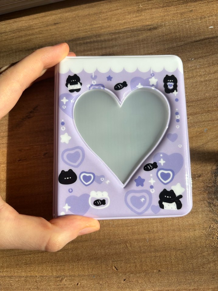 Kapakta kalp şeklinde şeffaf pencere bulunan, küçük siyah kedi figürleri ve kalp desenleriyle süslenmiş mor pastel renkli fotoğraf albümü. 18 çift taraflı sayfası vardır