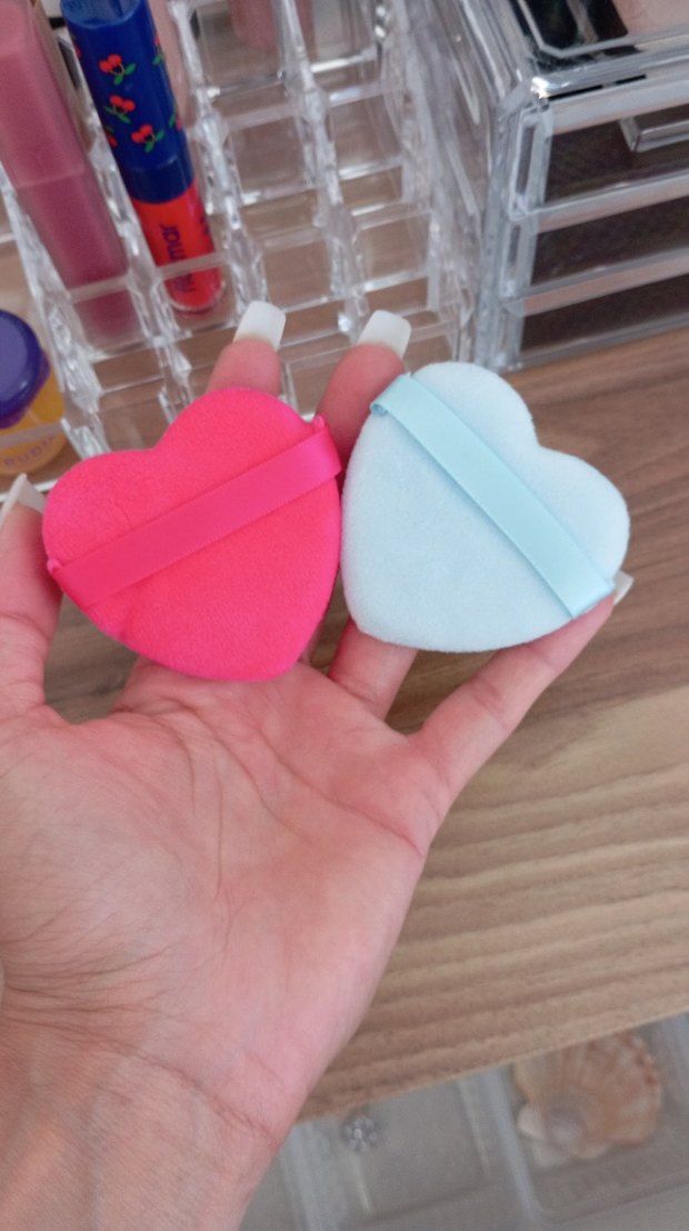 Kalp şeklinde, renkli ve bantlı makyaj süngerleri. Yumuşak dokusu ile makyajın eşit dağılmasını sağlar.