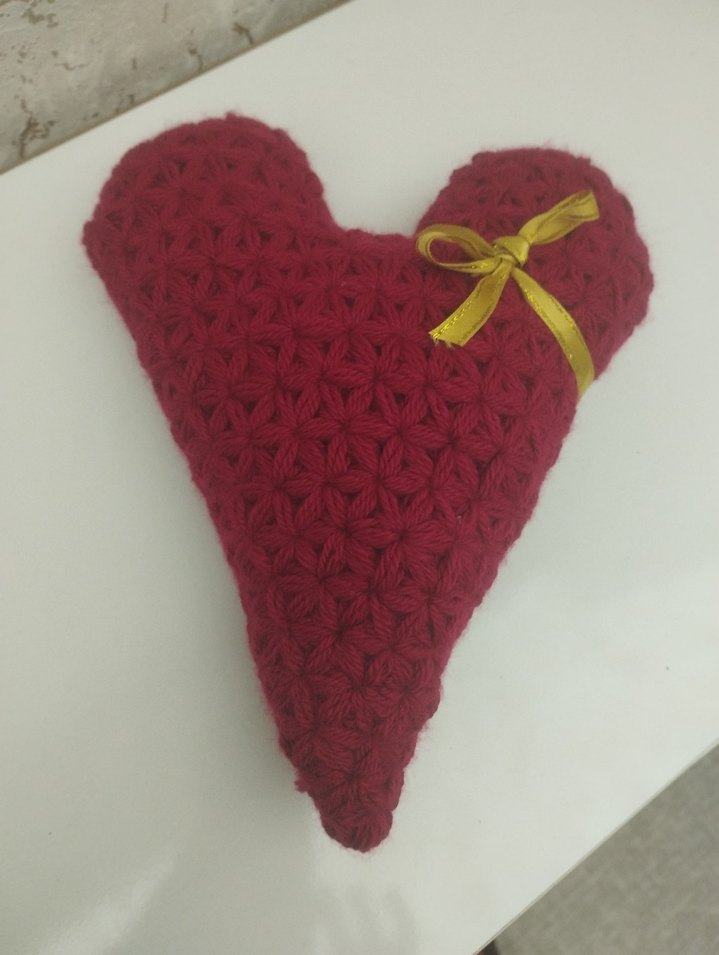 kırmızı renkli, nakışlı kalp şeklinde yastık, üzerinde küçük sarı kurdele detaylı. Yumuşak ve dekoratif bir ürün. ❤️