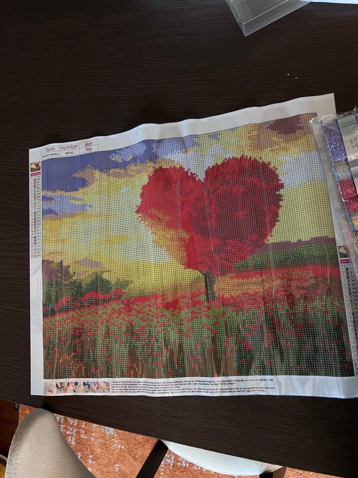 Kalp şeklinde ağaç ve çiçeklerle dolu bir tarlayı gösteren çok renkli, canlı ve koyu tonlarda bir mozaik tablo seti.Yeni