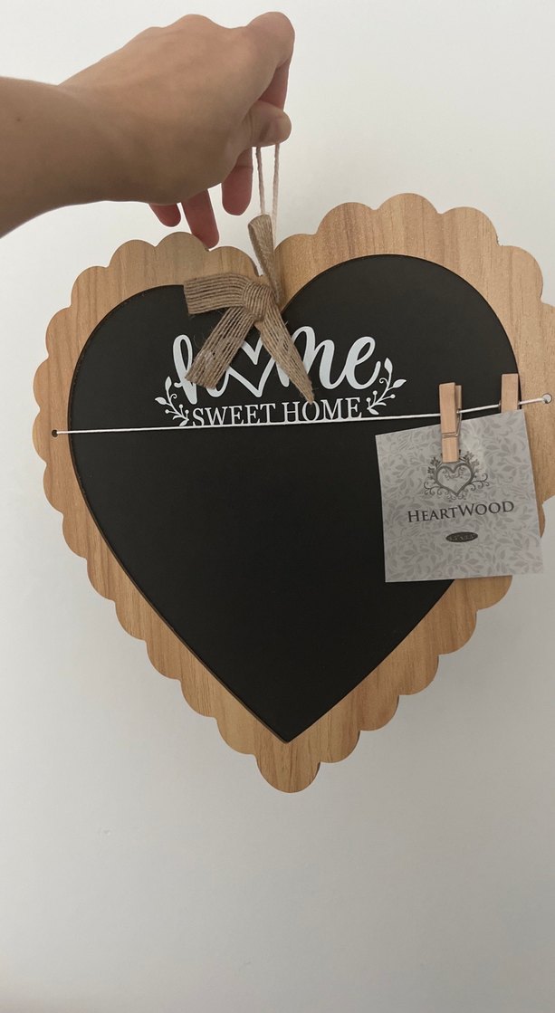 Koyu kahverengi çerçeveli kalp şeklinde ahşap ev dekoru, siyah merkezde 'Home Sweet Home' yazısı bulunur. Küçük fiyonk ve not asmak için mandal içerir.