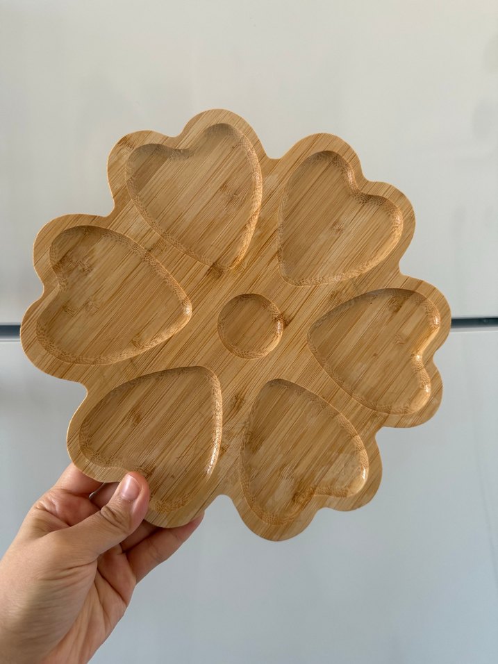 Bej renkli, çiçek deseni şeklinde beş kalp şeklinde bölmesi olan ahşap servis tabağıdır.