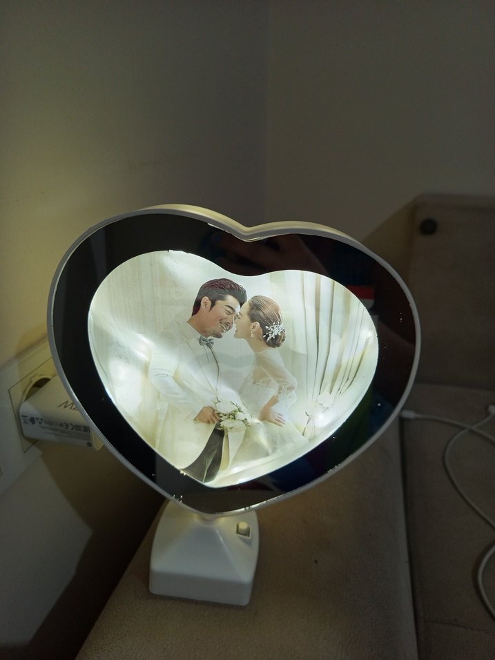 Beyaz çerçeveli kalp şeklinde ayna, yumuşak aydınlatmalı ve romantik fotoğraf sergileme özelliğine sahip. Dekoratif kullanım için uygun.