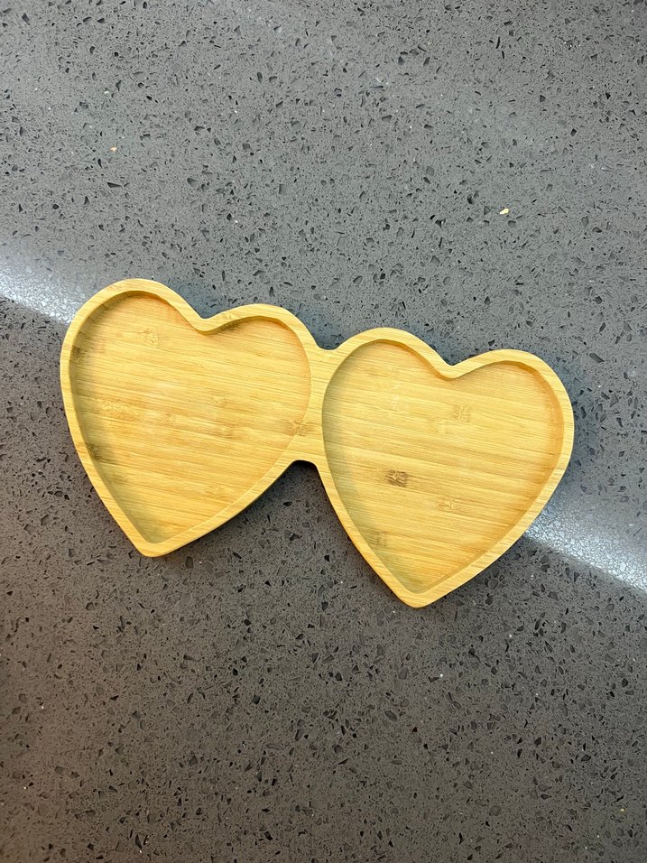 Doğal malzemeden yapılmış, iki bölmeli bej renkli kalp şeklinde tabak. Yiyecekleri ayırmak için uygun. Kahve yanı serviste uygun