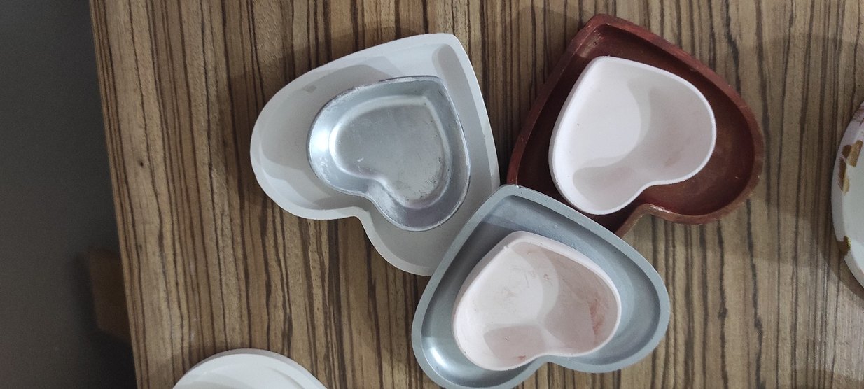 Gri ve bej renklerde kalp şeklinde kek kalıpları seti, farklı tatlılar için uygun. ❤️ Taş tozundan yapılmış el yapımı