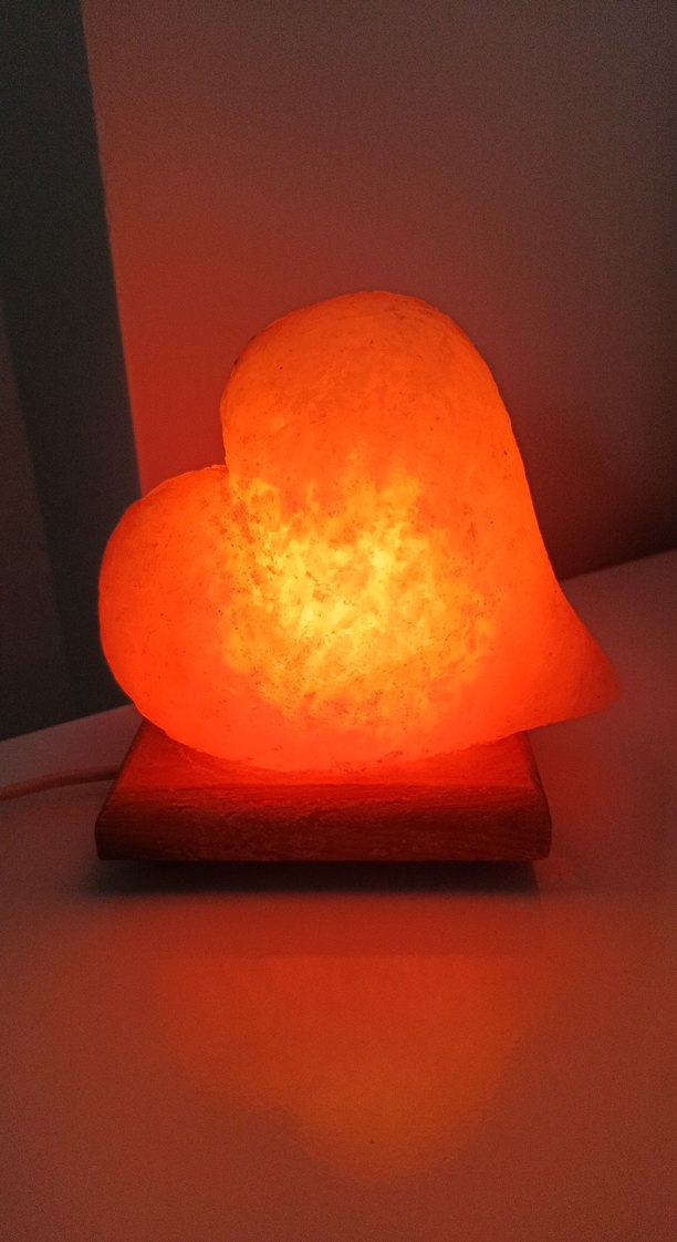 Ahşap taban üzerinde kırmızı ışıklı kalp şeklinde tuz kristali olan, sıcak ve renkli ışık yayan lamba. Ortama sıcaklık katıyor.