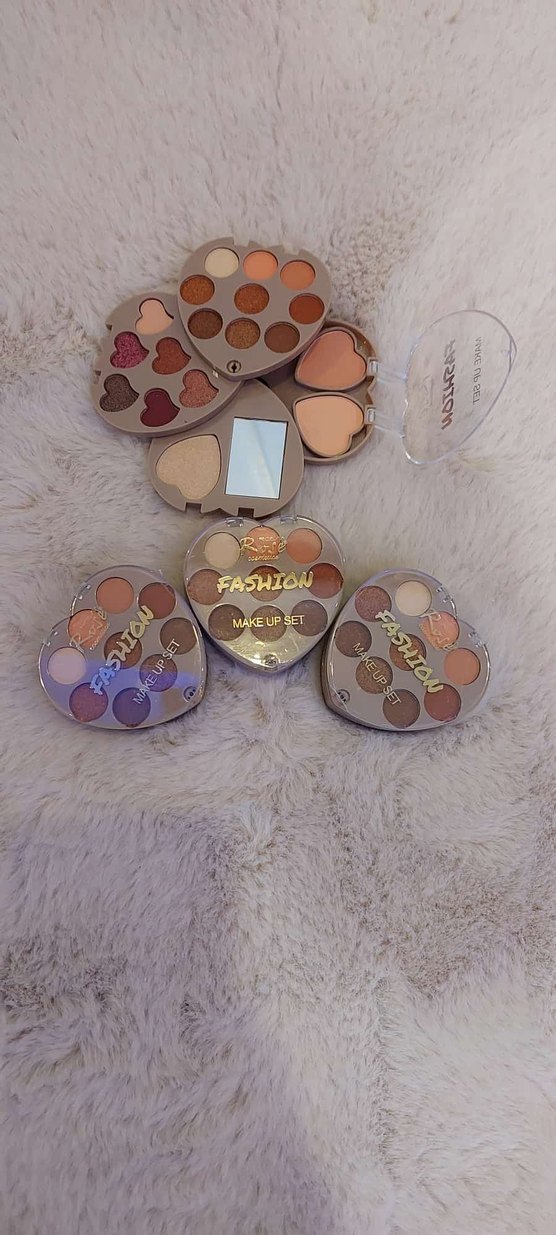 Kalp şeklinde, açık bej tonlarında mat ve parlak göz farlarından oluşan palet. Küçük ayna içerir, "FASHION MAKE UP SET" markalıdır.